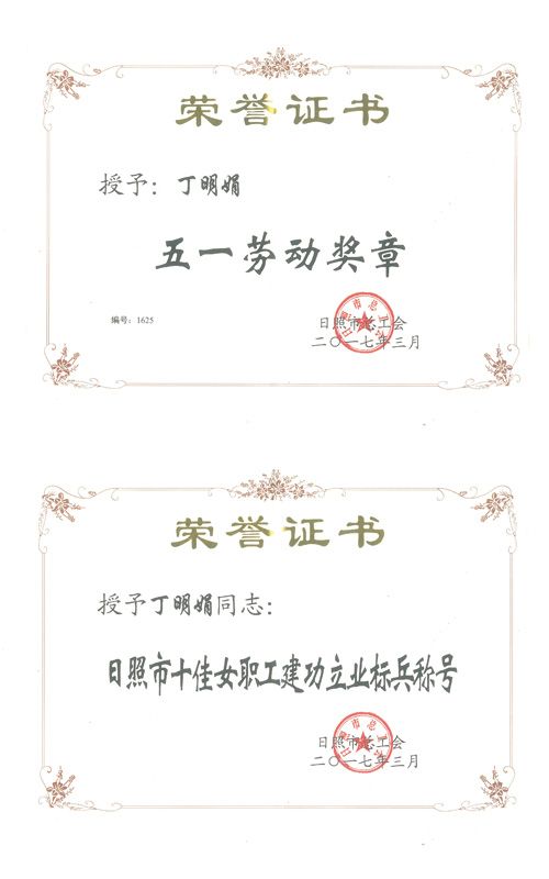 2017年3月,我公司財(cái)務(wù)總監(jiān)丁明娟被日照市總工會(huì)授予“五一勞動(dòng)獎(jiǎng)?wù)隆薄ⅰ叭照帐惺雅毠そüαI(yè)標(biāo)兵”稱號(hào)