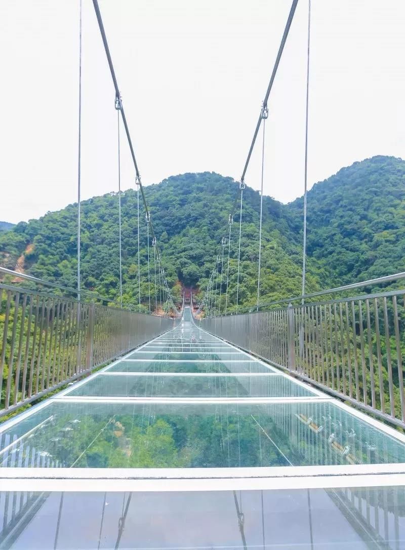 古龍峽玻璃橋全長329米,平均寬度3.8米,最寬處6.8米,橋上2個港灣式透明觀景凸臺位于最寬處,和UFO玻璃平臺遙相呼應。作為世界最寬的觀瀑玻璃橋,在國內第一家采用超大面積玻璃,橋面可以容納5人并行,也可從容地拍下全身照,面積達40平方米港灣式觀景凸臺設置了5D聲光電特效裝置,感應到游客經過時,會出現“山崩地裂”“玻璃破碎”等奇幻效果。經浙江大學土木工程系測試,玻璃橋靜態負載可超過700人。